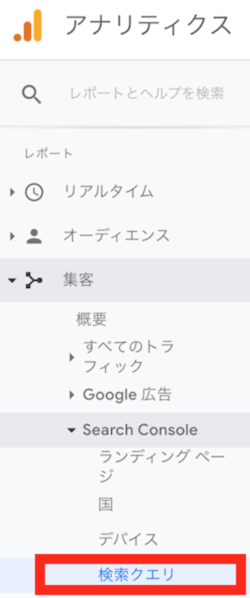 まず、「Google Analytics」へアクセスし、[レポート] ⇨ [集客] ⇨ [Search Console] ⇨ [検索クエリ]を選択します。