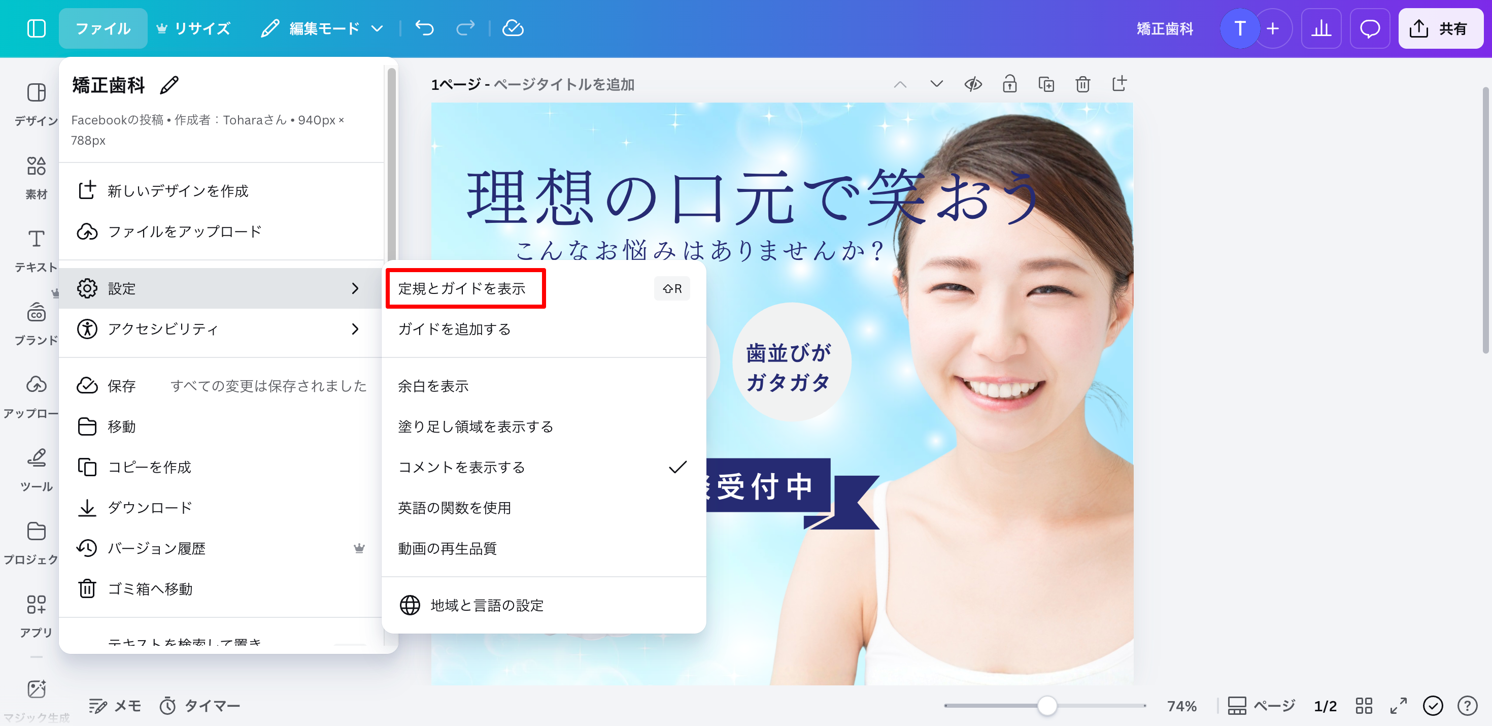 Canvaでデザインを作るときは、作り始める前にガイド線を表示する。