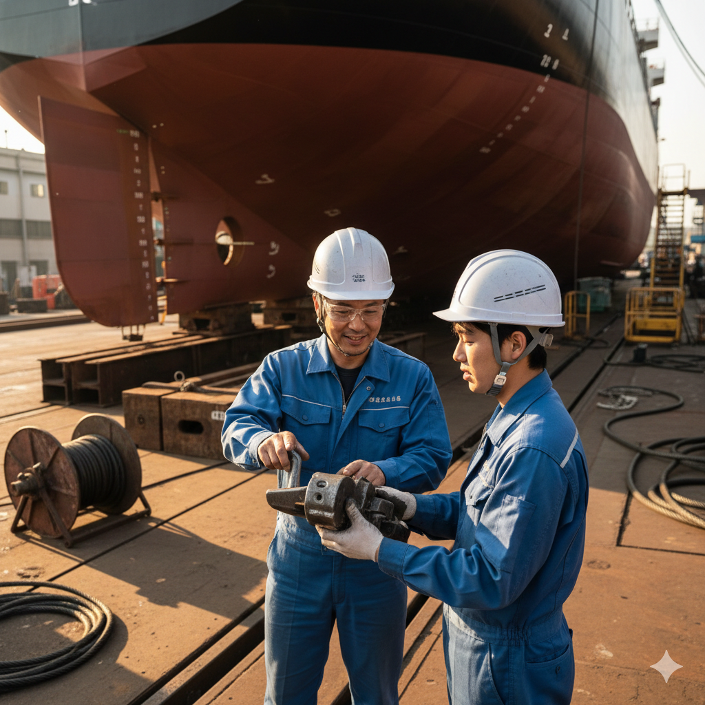 - 現場感: 作業着やヘルメット、背景のちらっと見える船体で、造船現場であることが伝わります。