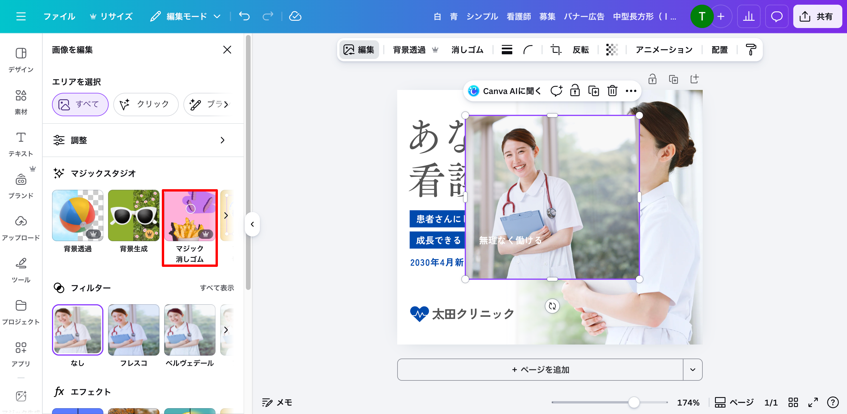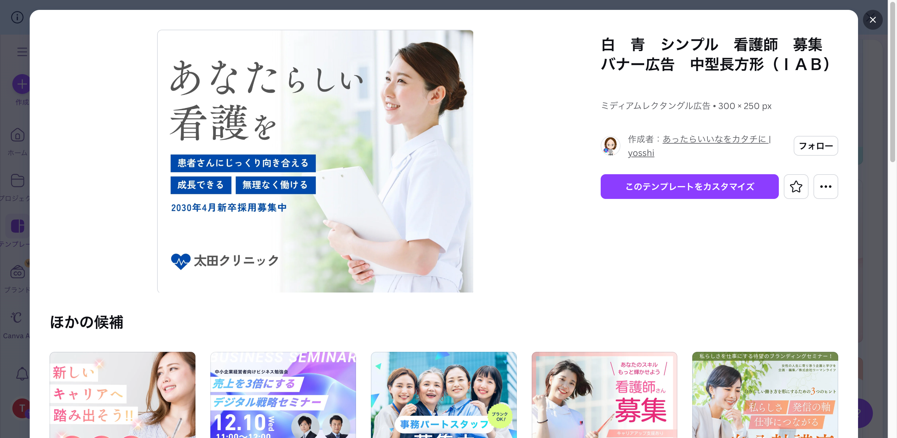 Canvaの検索窓で「看護師 求人」や「クリニック 求人」と検索します。