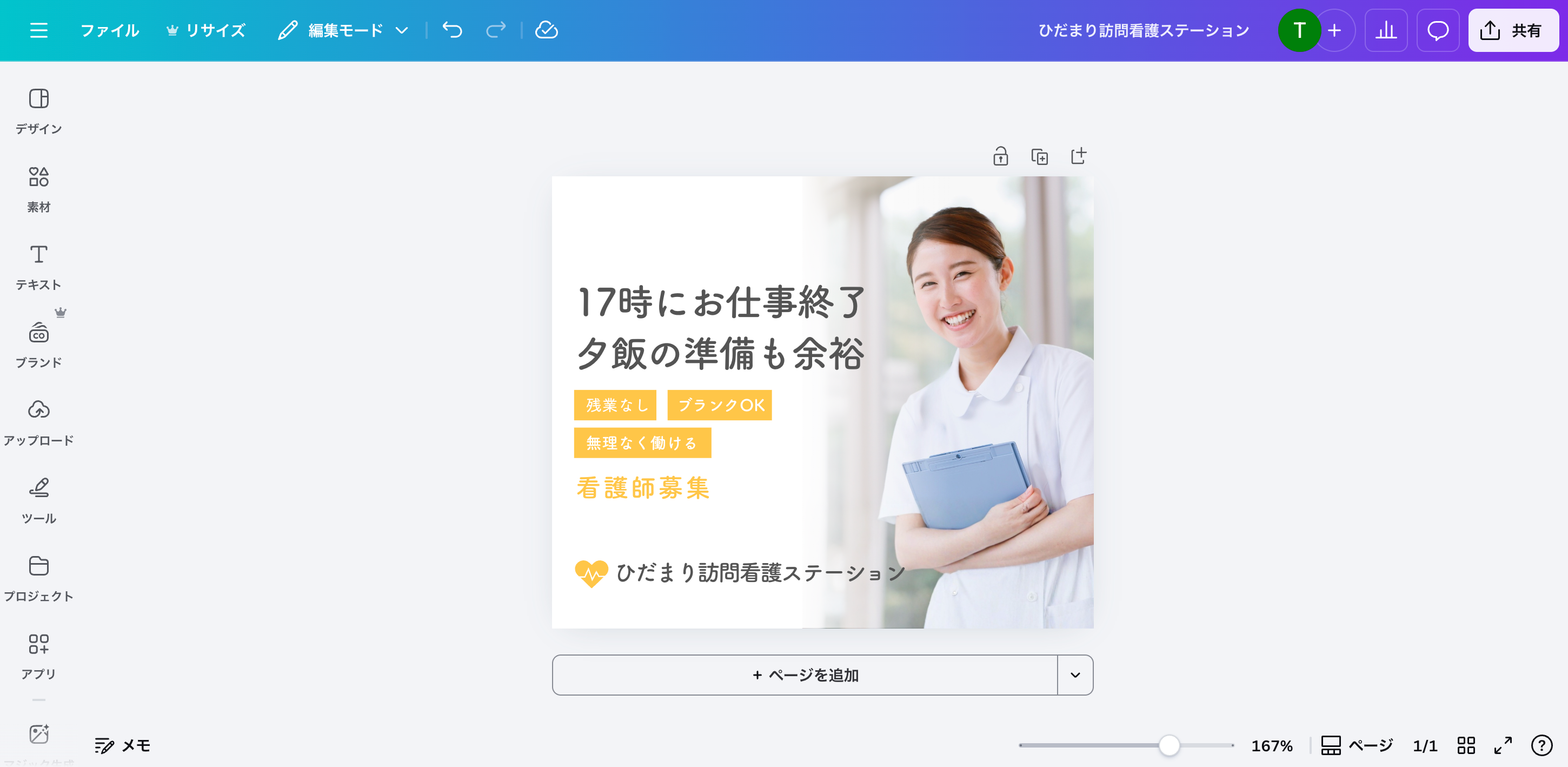 Canvaを使えば、専門的なデザイン知識がなくても、あなたの職場の温かさや魅力を直感的に形にできます。今回は看護師採用を例に挙げましたが、このステップは事務職、介護職、リハビリ職など、あらゆる職種の採用活動、さらには社内の案内掲示やイベント告知にもそのまま応用できます。