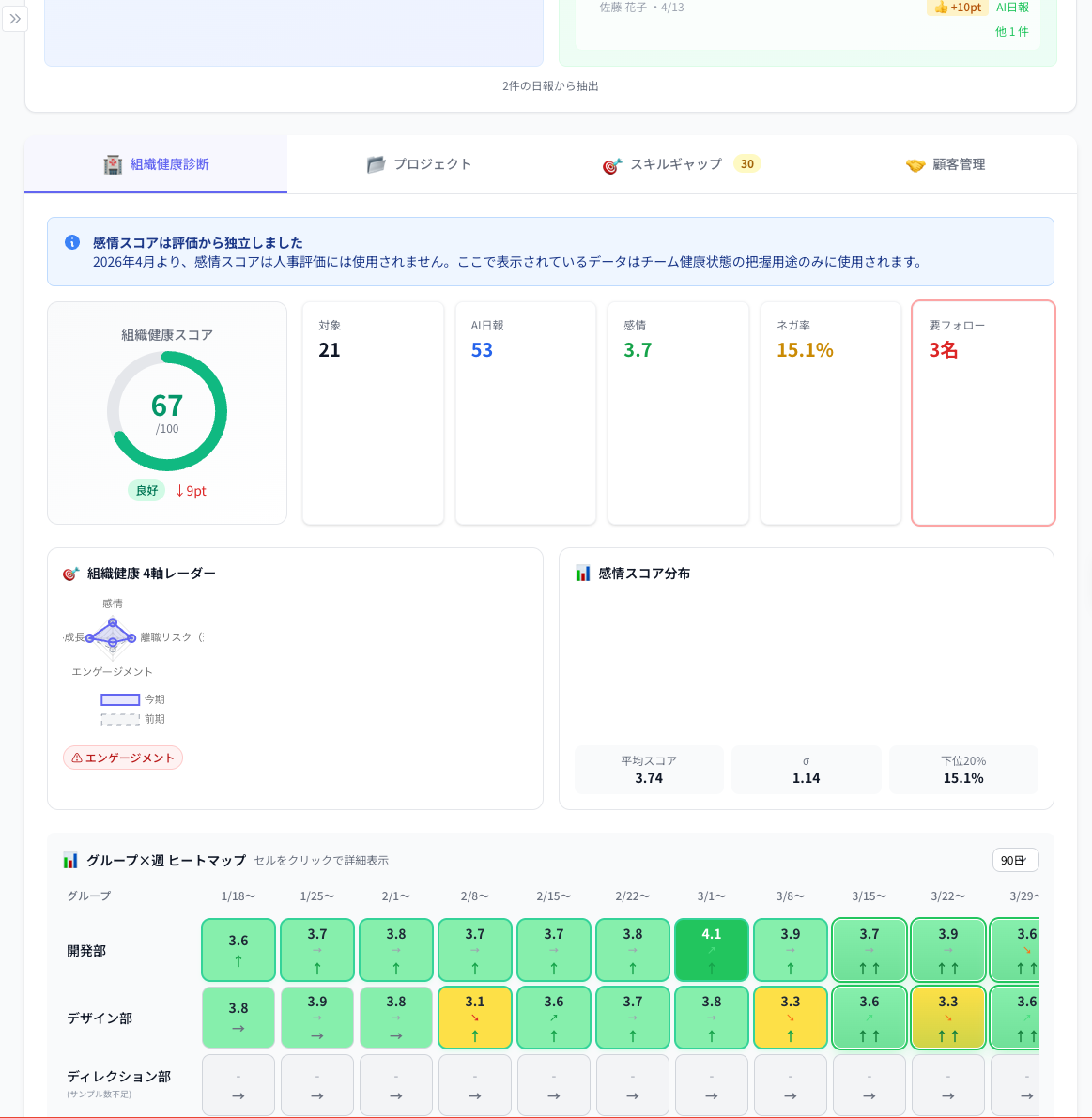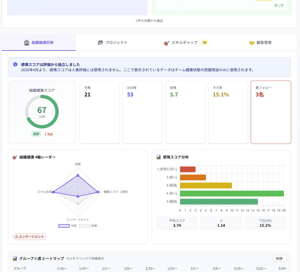 4軸レーダー(感情・離職リスク・エンゲージメント・スキル成長)で組織全体の健康状態を数値化。3週連続低下で経営層にアラート。