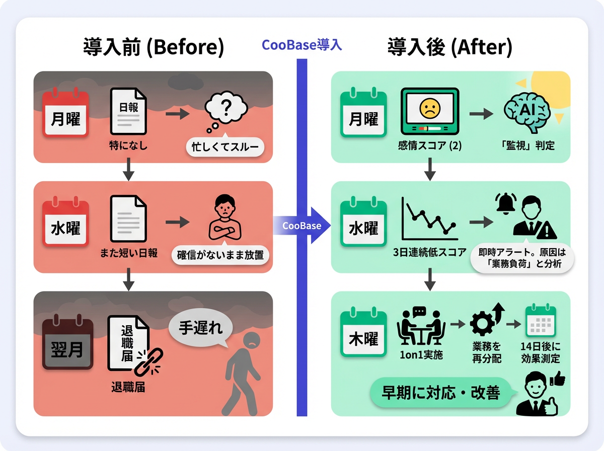 | 水曜 | AIが「3日連続低スコア」を検知。マネージャーに即時アラート。原因は「業務負荷」と分析。 |