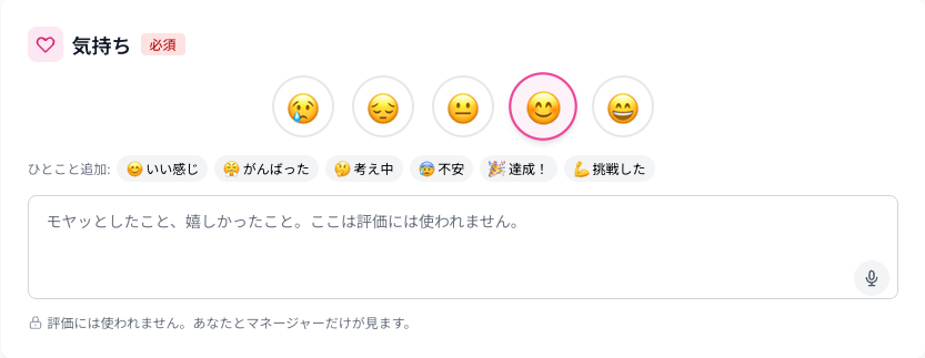日報提出時に、スタッフは今日の気分を絵文字5段階で選択します。たった1タップの操作ですが、このデータが蓄積されると強力な「組織の温度計」になります。