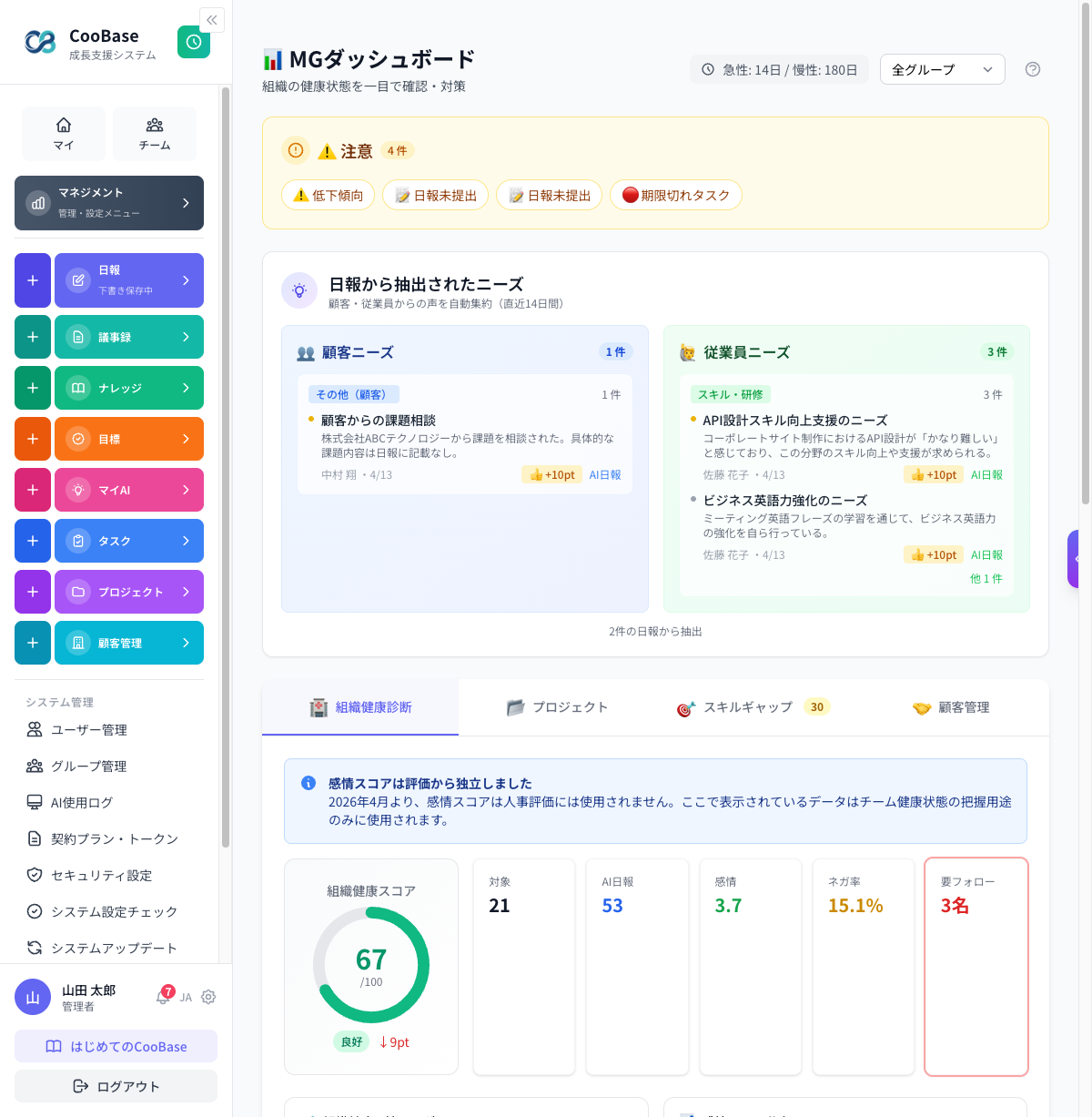 CooBaseでは、毎日の日報データをAI(Gemini API)がリアルタイムで分析し、人間では気づきにくい「離職の兆候」を自動的に検知します。