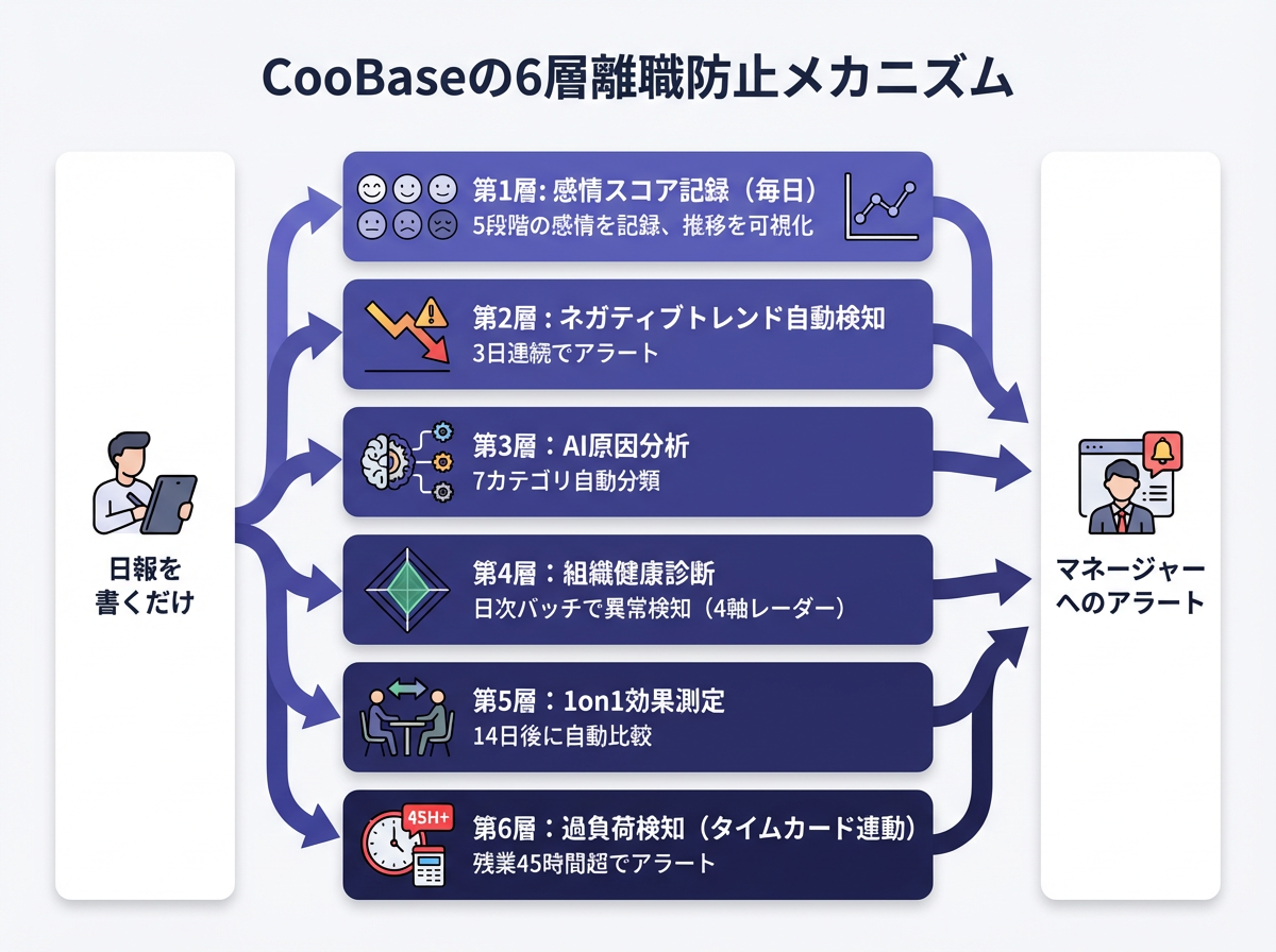 CooBaseでは、離職リスクを単一の機能ではなく、6つの層で多角的に捉えます。スタッフは「日報を書くだけ」で、この6層すべてが自動的に動作します。