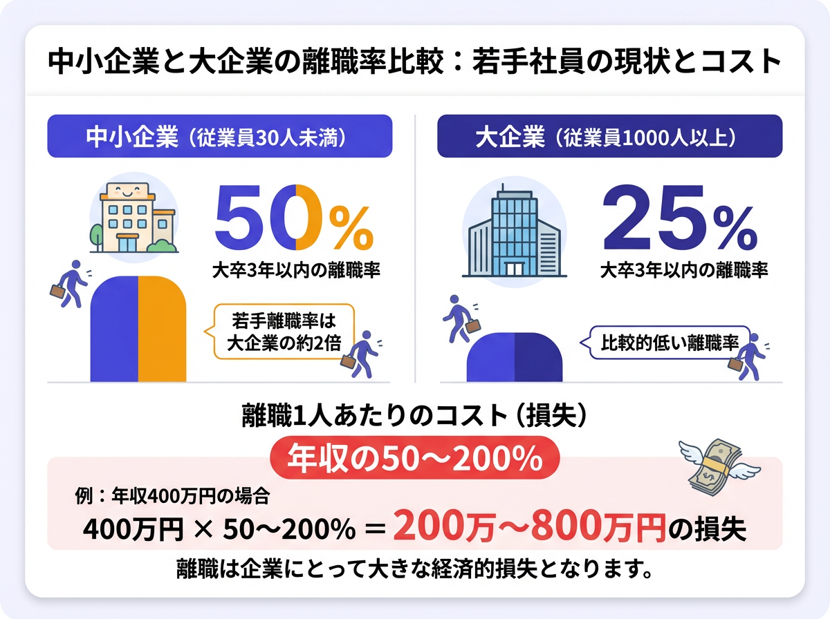 厚生労働省の調査によると、従業員30人未満の企業における大卒3年以内の離職率は約50%。一方、従業員1,000人以上の企業では約25%です。中小企業は大企業のおよそ2倍の速さで若手を失っています。